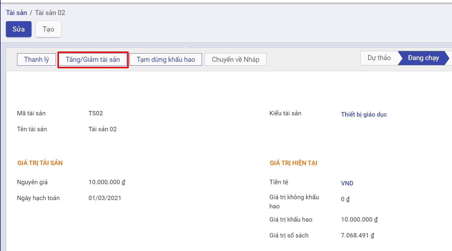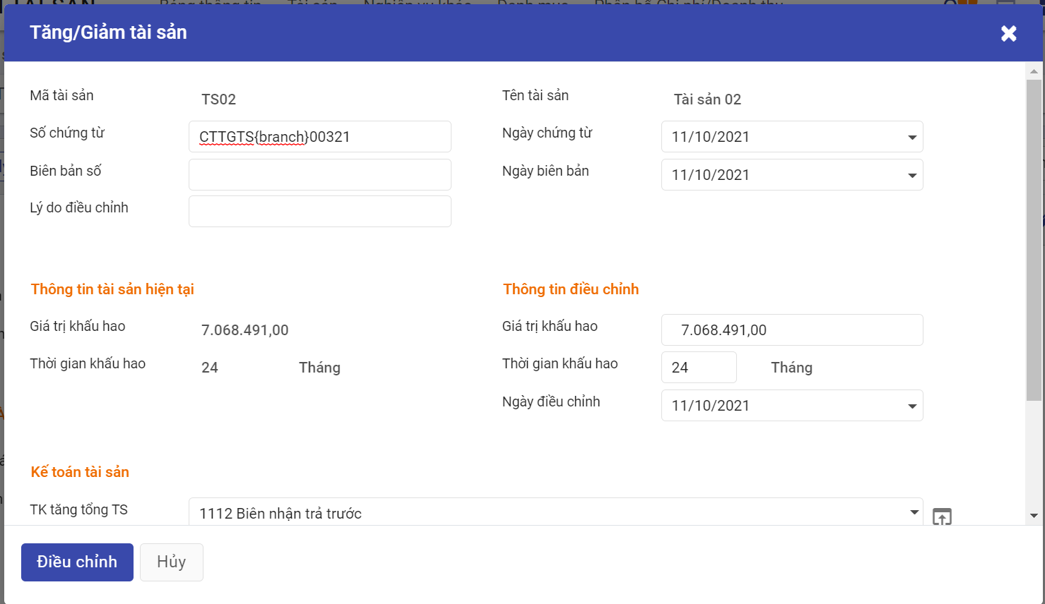 · Điều chỉnh Tăng Giá trị/Thời gian khấu hao của Tài sản. Chi tiết nghiệp vụ tại đây