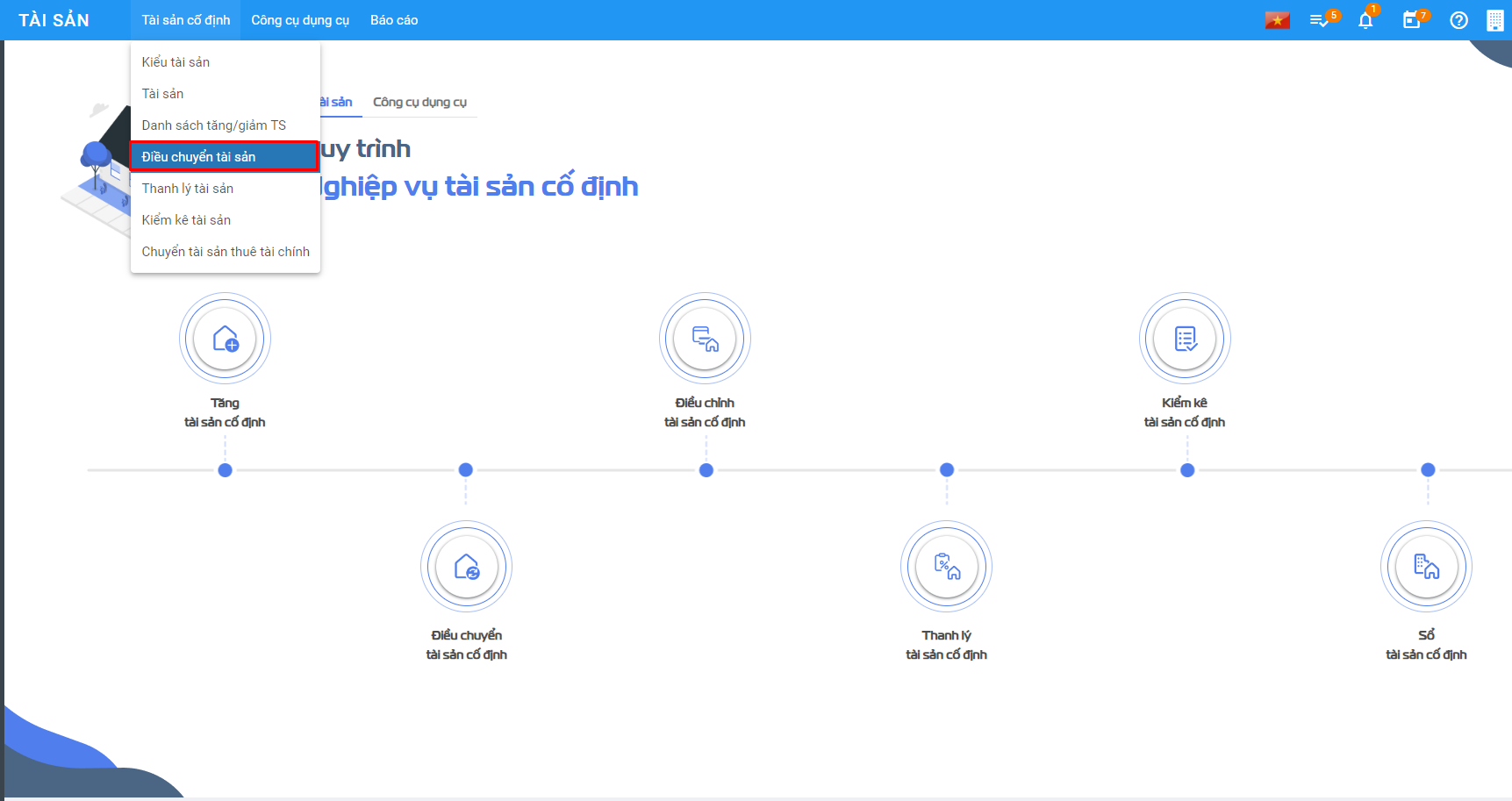 Bước 1: Vào chức năng Kế toán tài sản -> Chọn Tài sản -> Chọn Điều chuyển tài sản