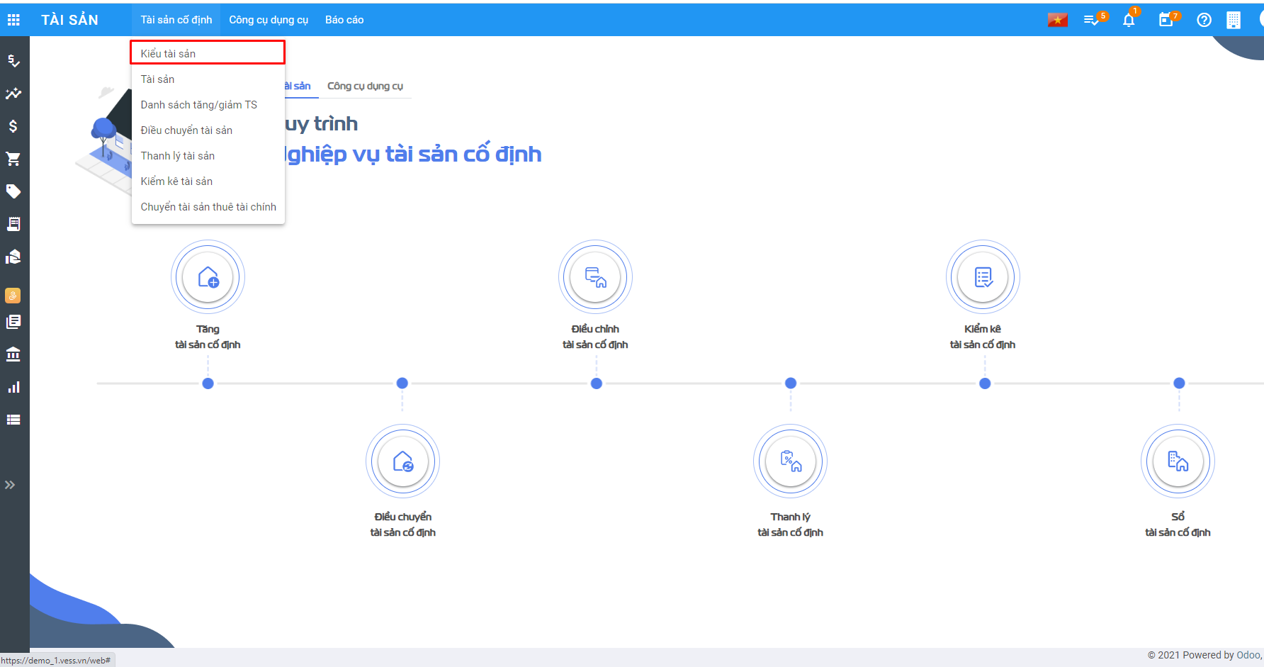 Bước 1: Vào phân hệ Tài sản -> Chọn thư mục Tài sản cố định -> Chọn Kiểu tài sản