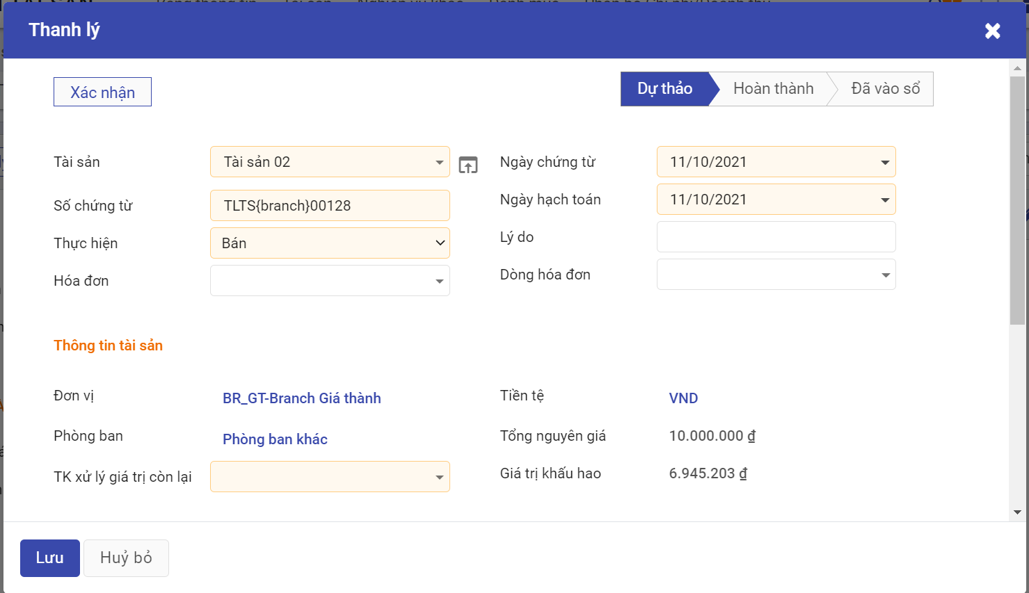 - Chọn ngày chứng từ và hạch toán ghi nhận hành động thanh lý