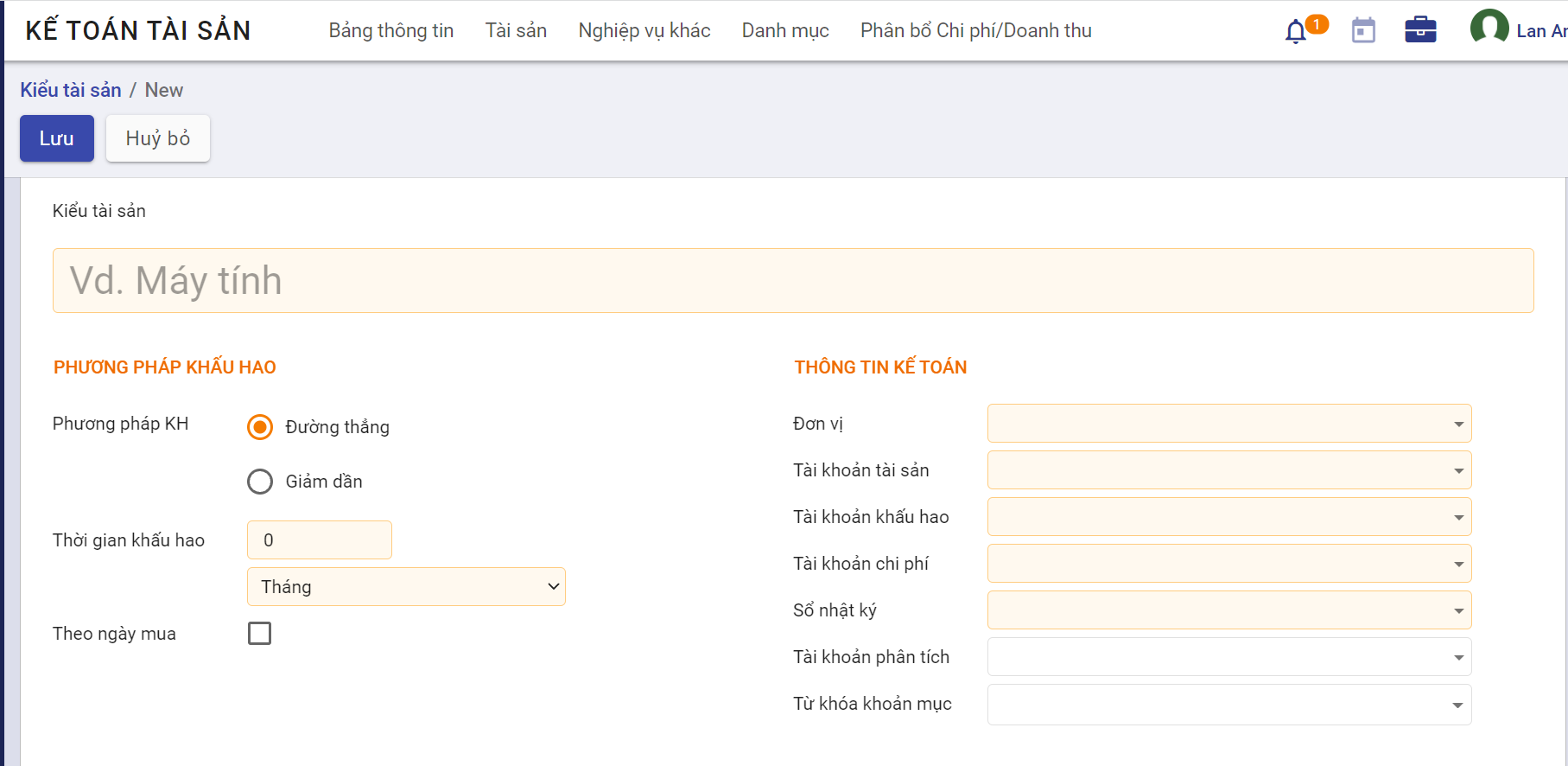 - Thời gian khấu hao: Nhập thời gian khấu hao mong muốn theo tháng hoặc năm