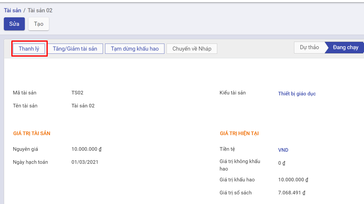 - Bản ghi Tài sản sẽ ở trạng thái Đóng