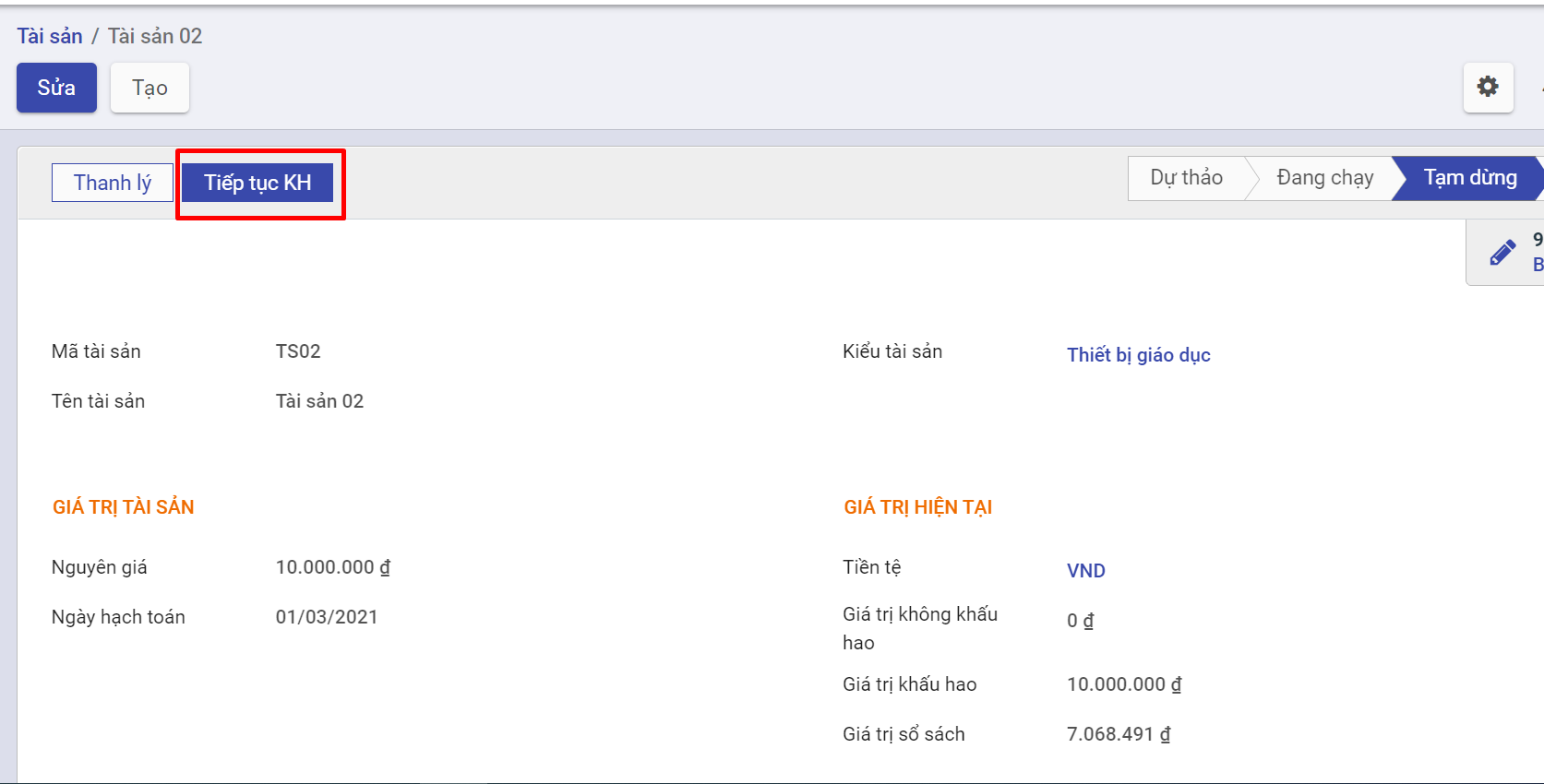 Bước 1: Vào chức năng Kế toán tài sản -> Chọn Tài sản -> Chọn bản ghi tài sản muốn Tiếp tục khấu hao ( Bản ghi ở trạng thái Tạm dừng)