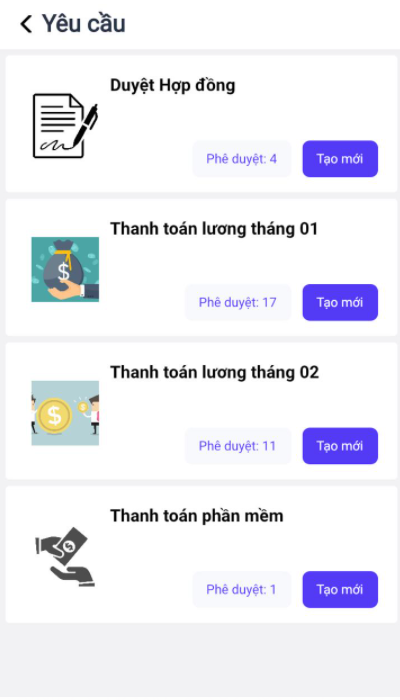 Phê duyệt trên Mobile: Cá nhân tạo yêu cầu phê duyệt và các yêu cầu được phê duyệt bởi người được chọn. Chi tiết nghiệp vụ tại đây.